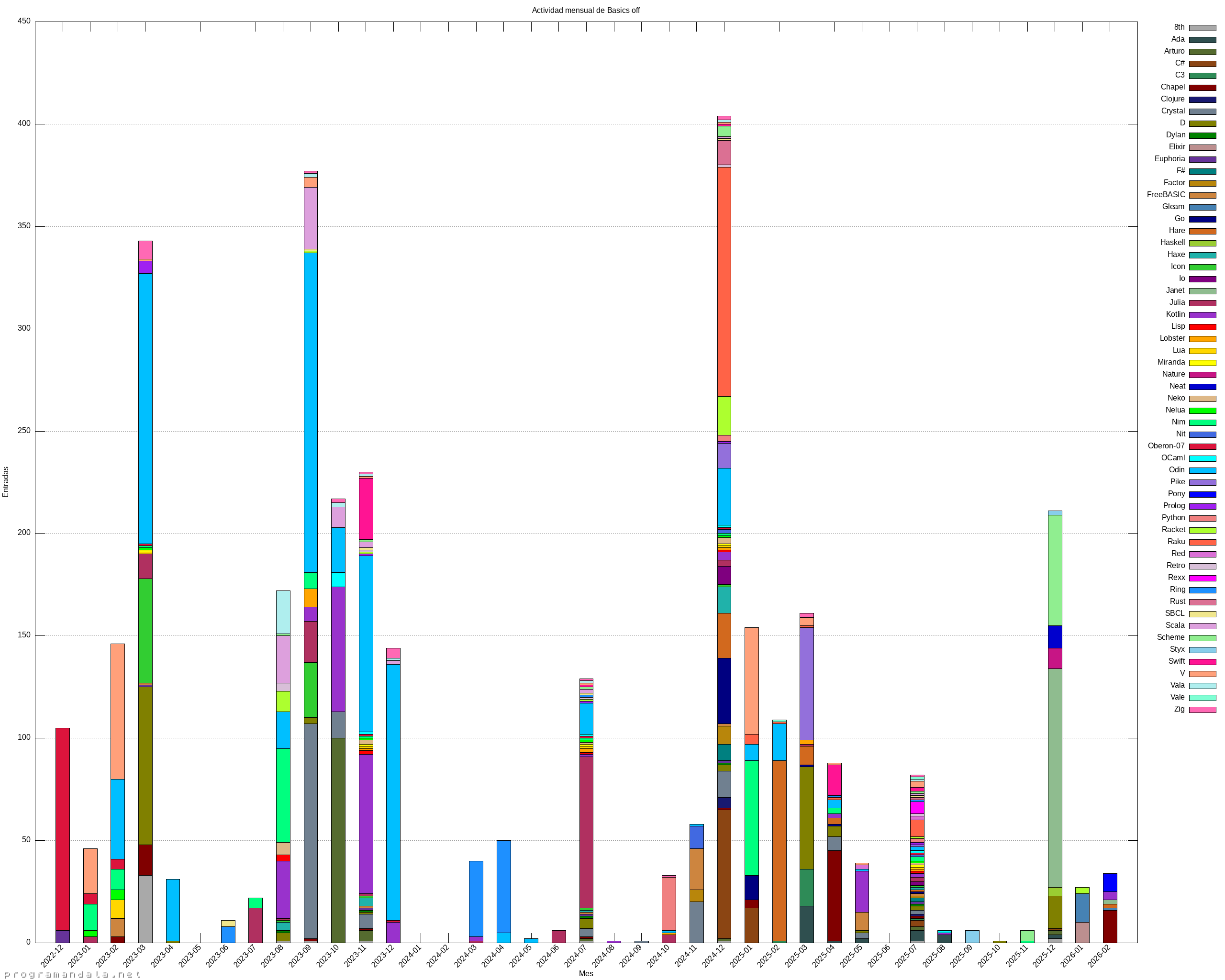 Basics off es un metaproyecto sobre los 58 proyectos «Basics of…» (49 comenzados). Consta de tres programas que usan el contenido de los repositorios para contar las conversiones (en fish), extraer los datos de actividad (en Julia), y construir las páginas web (en D); así como de varios ficheros de gnuplot que crean los gráficos, y un Makefile para construir todo. Los resultados se muestran a continuación: los informes sobre las conversiones, los gráficos de actividad y un informe sobre el tamaño de un ejecutable, elaborado a mano.